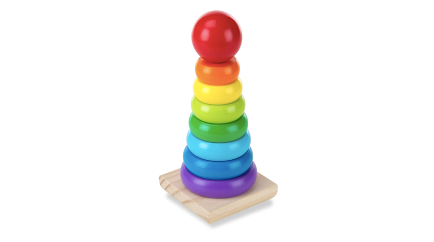Talk about a classic childhood toy. All the colours of the rainbow are represented by these eight smooth, easy - grasp wooden pieces. Stack them on the solid wood base, designed with rocking edges for safe and intriguing play.